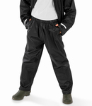 100% polyester with PVC inner coating. Waterproof 2000mm with taped seams.Windproof.Elasticated waistband.Waist vents to access inner pockets.Open leg ends with snap adjusters.Cut out label.